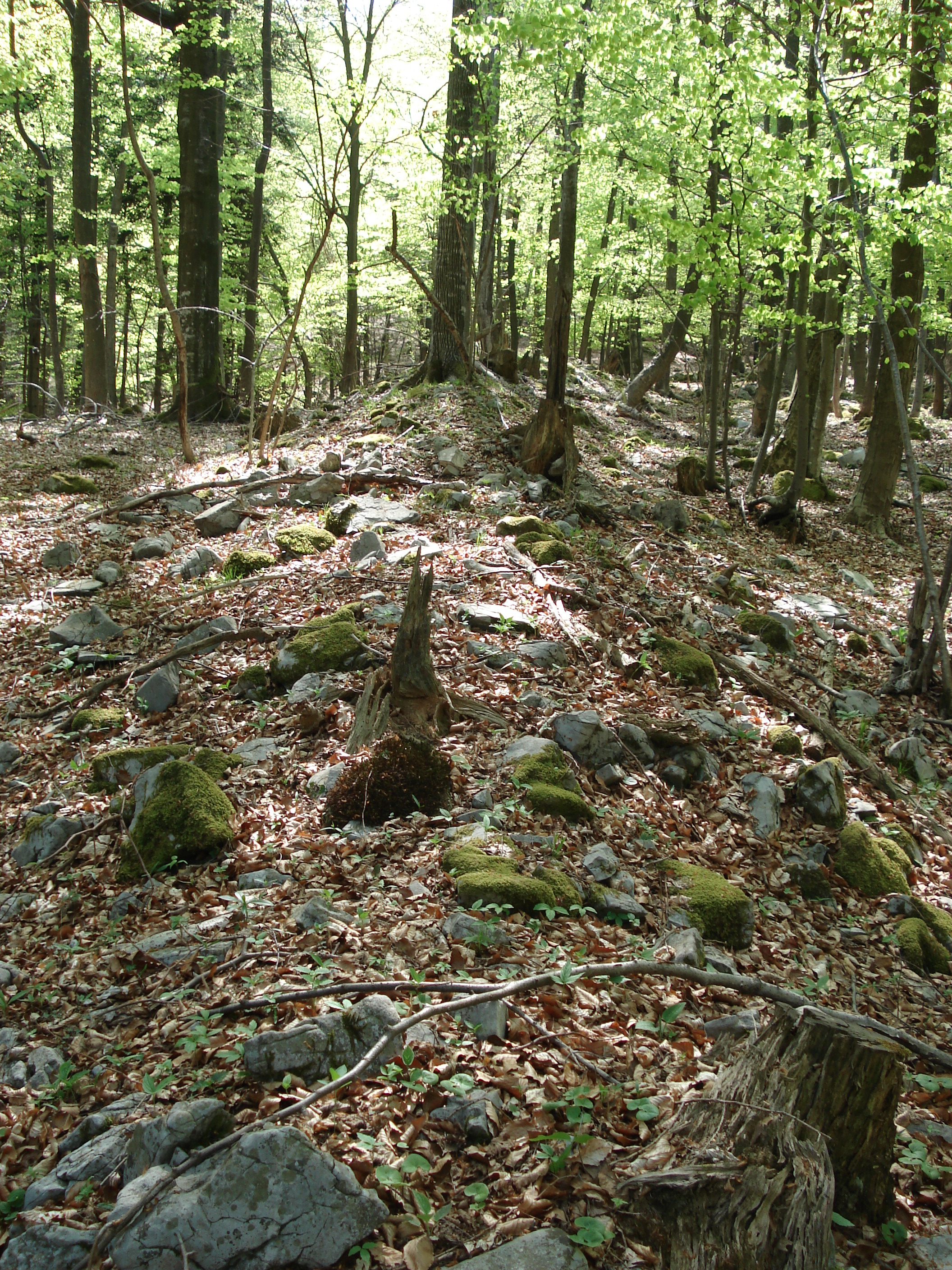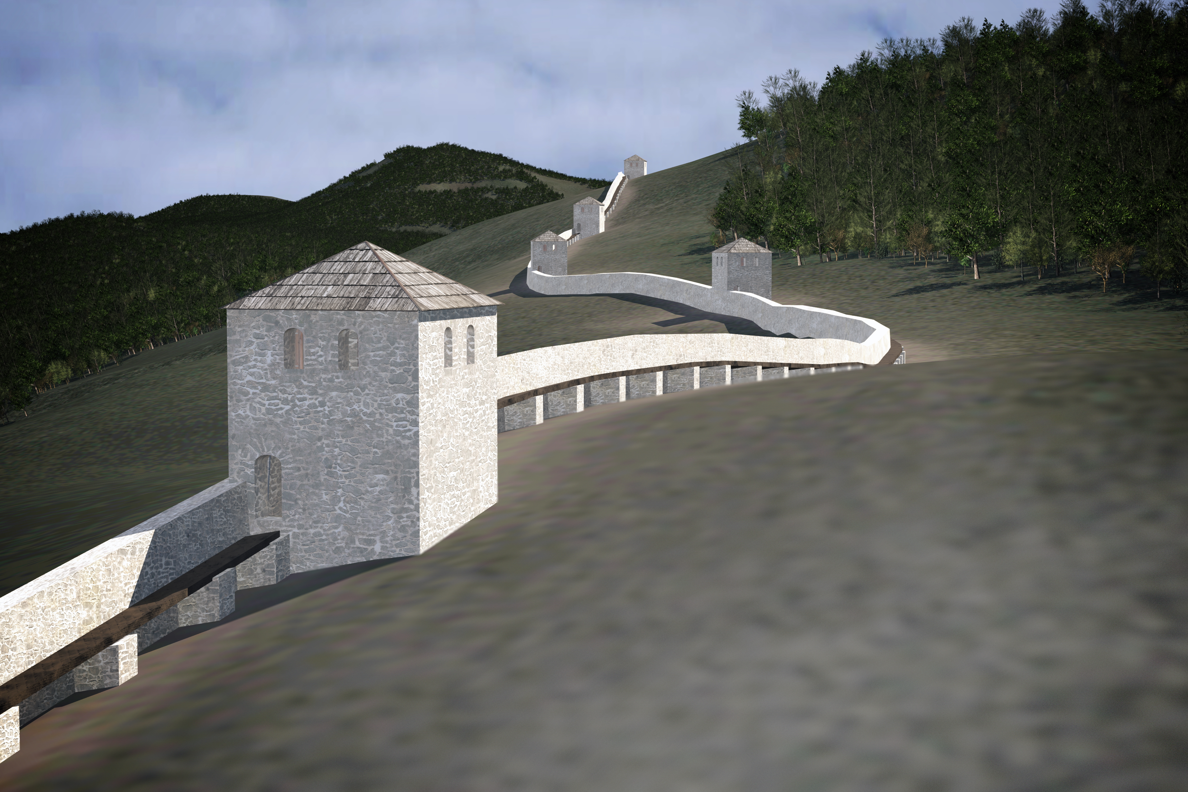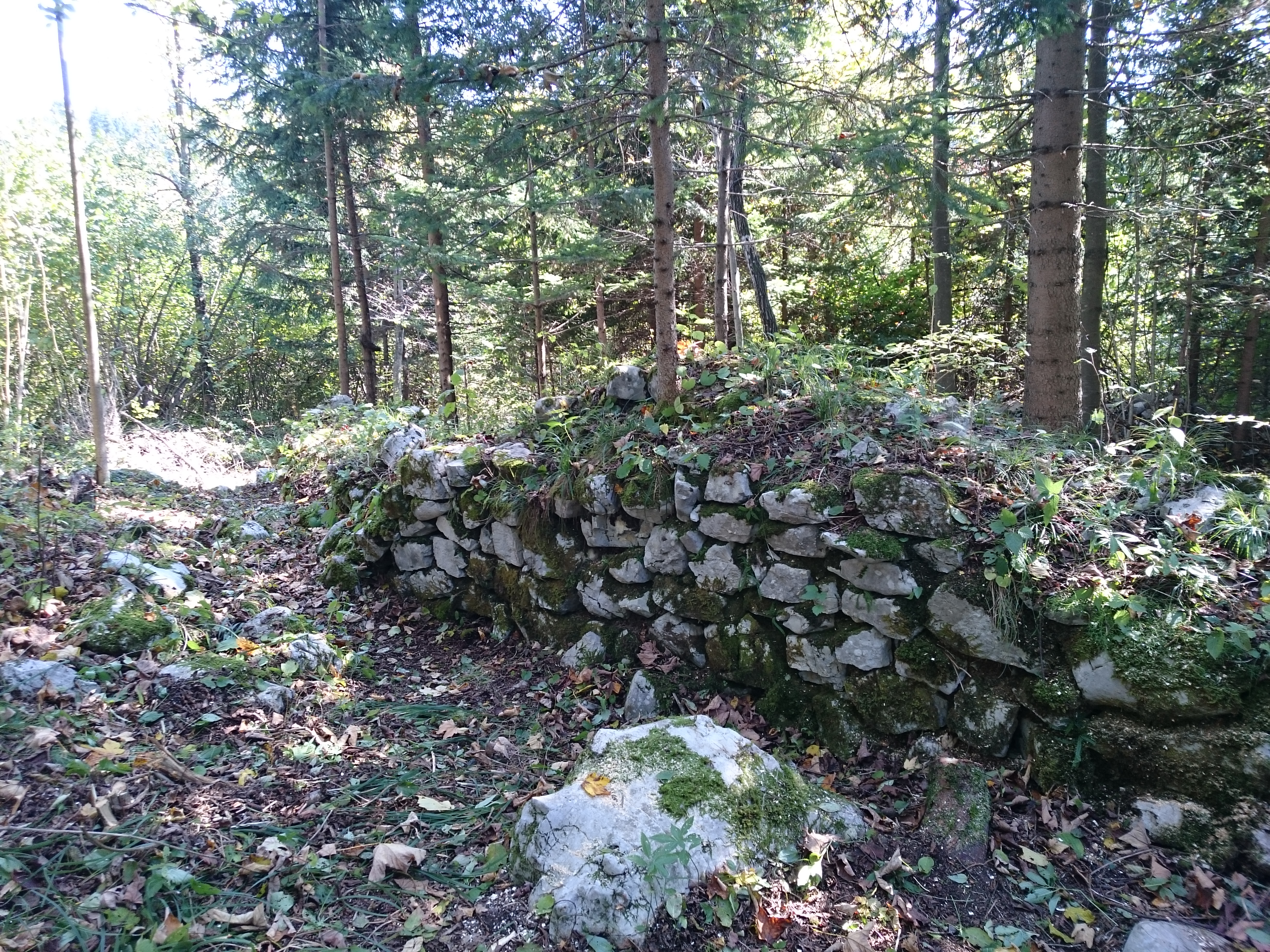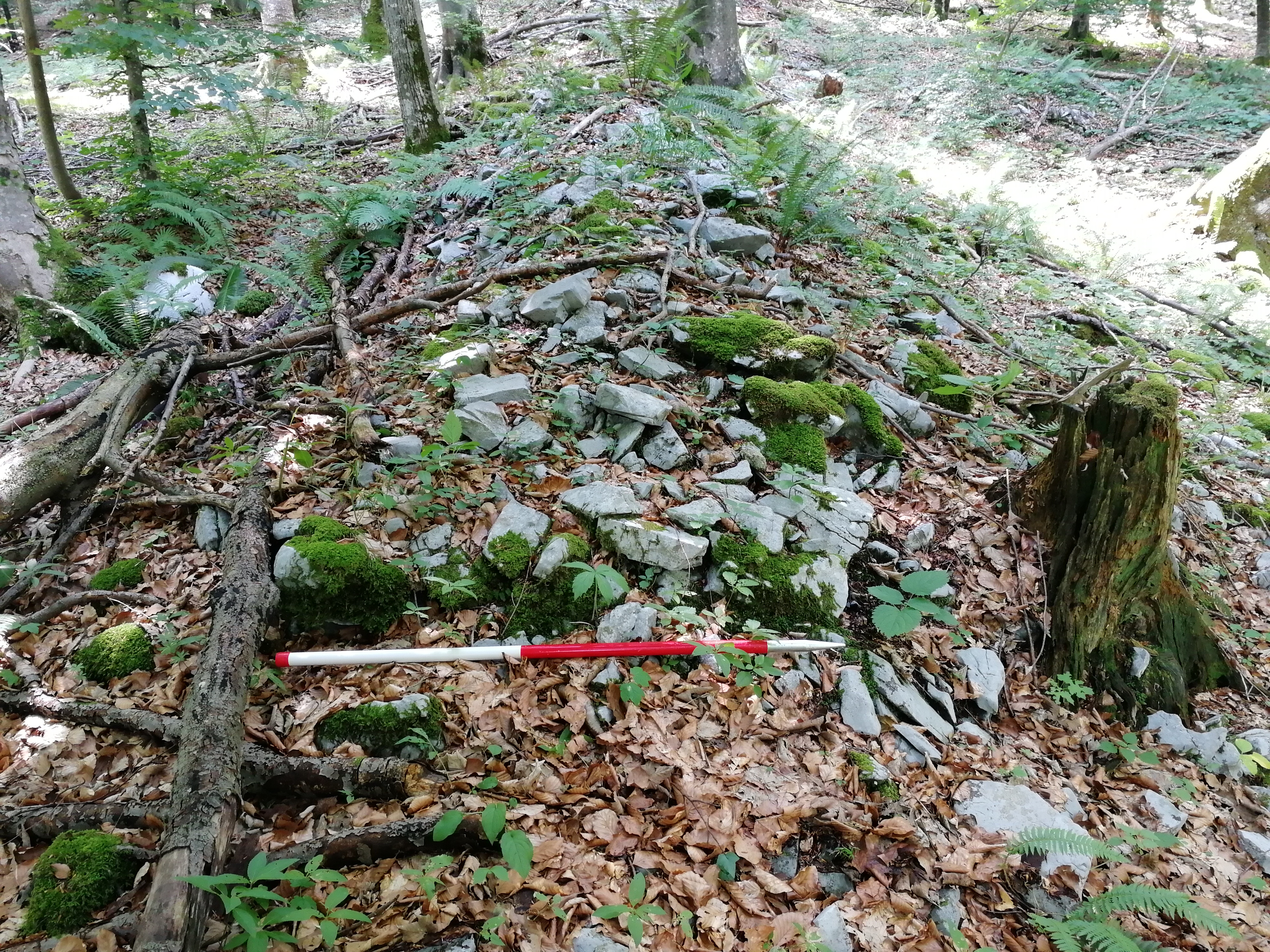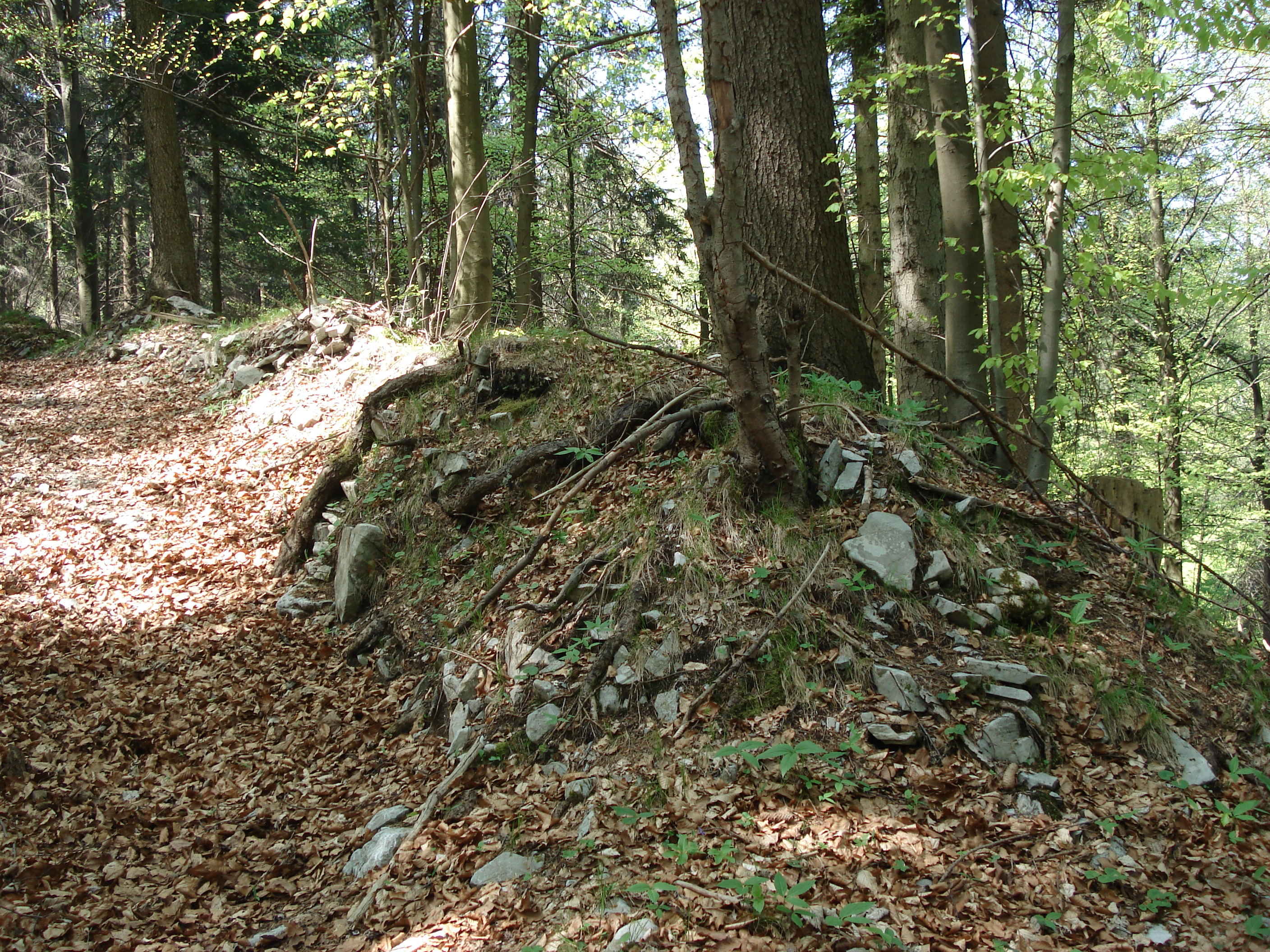 The Ajdovski zid barrier, which is located above the westernmost edge of the Ljubljana Marshes, was the first in a series of barrier walls that controlled the main Roman road Emona – Aquileia. In the southwest it starts at the crossing between the Javorč Hill and the Ljubljanski vrh Hill, above the present-day railway station Verd. Ajdovski zid wall runs southwest along the northern slope of the Ljubljanski vrh Hill, where it ends just below the peak on the steepest slope. We can follow it again after roughly a kilometre on the south-western slope, where it crosses the mountain pass and continues on the slopes of the Bukov vrh Hill, from where it descends into the valley. There it is intersected by the Ljubljana – Logatec highway, which directs the wall over the Suhi hrib Hill on the other side. In the saddle of the Raskovec Mountain it crosses an old macadam road between Ljubljana and Trieste and ends at the top of the Raskovec Mountain. It continues on its north-western slope, over the Cesarski vrh Hill, where it was destroyed by 3 traffic lines at the distance of 200 m – the old and the new roads called Tržaška cesta and the railway. On the other side, the wall rises along the slope of the Smrekovec Mountain, turns to the northwest in the form of an arch and leads to the Strmica Mountain and then descends into the hamlet of Zaplana. Due to the construction of the infrastructure, the barrier there is destroyed to a large degree. The last section of the wall can be followed along the southern slope of the Špik Mountain, where the wall ends beneath the top of the mountain.